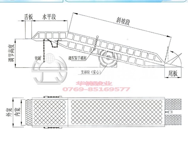 | 2、可調節長度的索鏈能方便地鉤住貨車,使移動式登車橋與貨車始終緊密貼合。 |